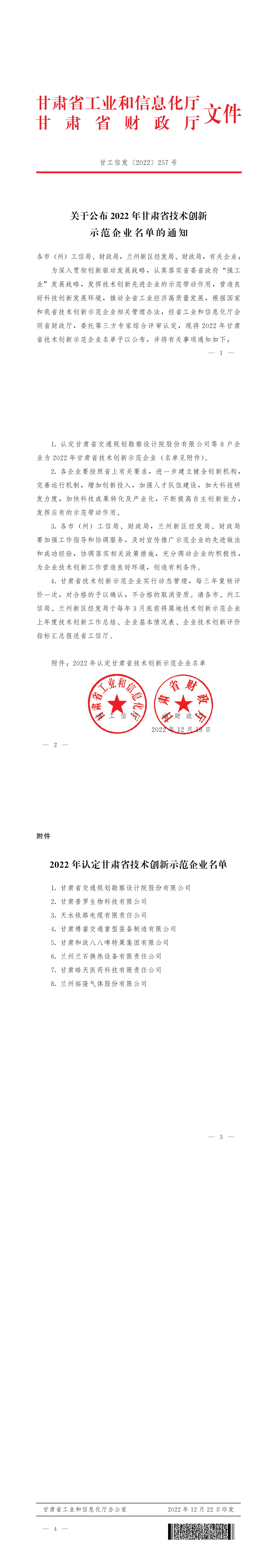 2022年12月22日,甘肅省工業和信息化廳、甘肅省財政廳聯合下發《關于公布2022年甘肅省技術創新示范企業名單的通知》(甘工信發[2022]257號)文件,正式認定甘肅皓天醫藥科技有限責任公司為“2022年甘肅省技術創新示范企業”。